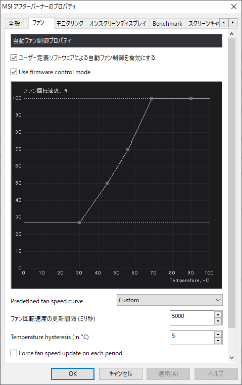 GPUの温度が上がりすぎないよう、ファンの速度を設定します。MSI AfterBurnerをインストール、設定画面を開き、温度とファンのコントロールを開きます。プリセットでは90℃でファンの回転数が100%になる設定でしたが、70℃で100%回転するように変更します。