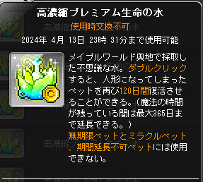 次に、高濃縮プレミアム生命の水。これはポイントショップで販売しているプレミアム生命の水の強化版です。プレミアム生命の水が290P(メル換算で100mメル程度)で30日間ペットの期限を延長するのに対し、高濃縮プレミアム生命の水はオークション価格150450mメルで120日間ペットの期限を延長してくれます。