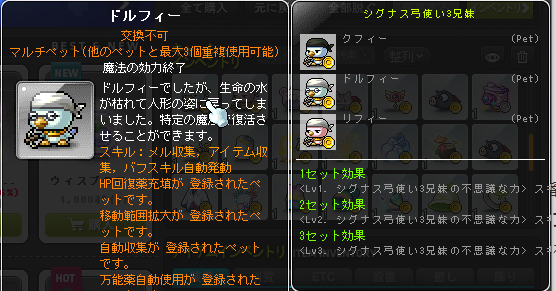 | ルナドリーム | 時価 | 有期限 | メル収集、アイテム収集、自動収集、自動バフ機能 | AMA+9 | あり | 1900P | 5 | 9 | ペット代+1900PでAMA+50増加 | 定期的に生命の水の購入が必要。 |