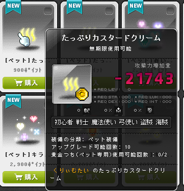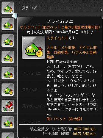 先述した通り、運が良かったら磁石ペットが手に入るわけで。その運をつかむ過程で、たくさんのハズレアイテムや、ハズレペット(どうあがいても磁石ペットにはならないペット)が発生し、これらがメイプルオークションに安価に、大量に販売されています。