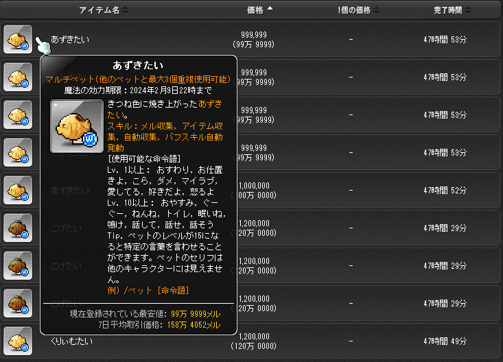 定期的にオークションに安価で供給(されるかもしれない)有期限ペットを買うのか、再販されるかわからない無期限ペットを待つのか、判断に迷うところではあります。
