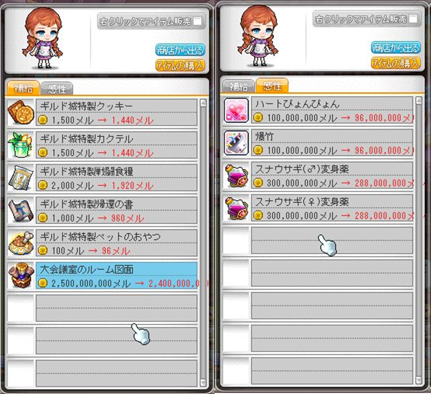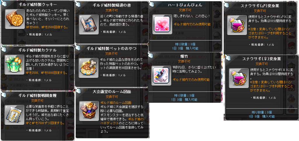 スーザンちゃんは消費アイテムとギルド城で使えるアイテムを売っています。