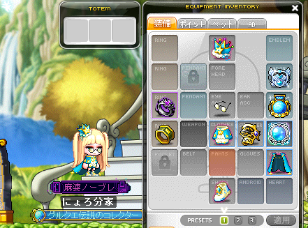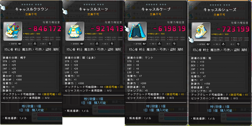 装備アイテムはブラック装備より少し強いくらいの能力の頭・体・マント・足装備です。誰でも装備できるので、特に初心者(職業)は重宝すると思いますが、いろいろなイベントでブラック装備が配られるので、見た目以外で購入する理由は今となってはないです。逆に見た目だけは可愛いので、おしゃれさんは購入する価値はあるかもしれません。