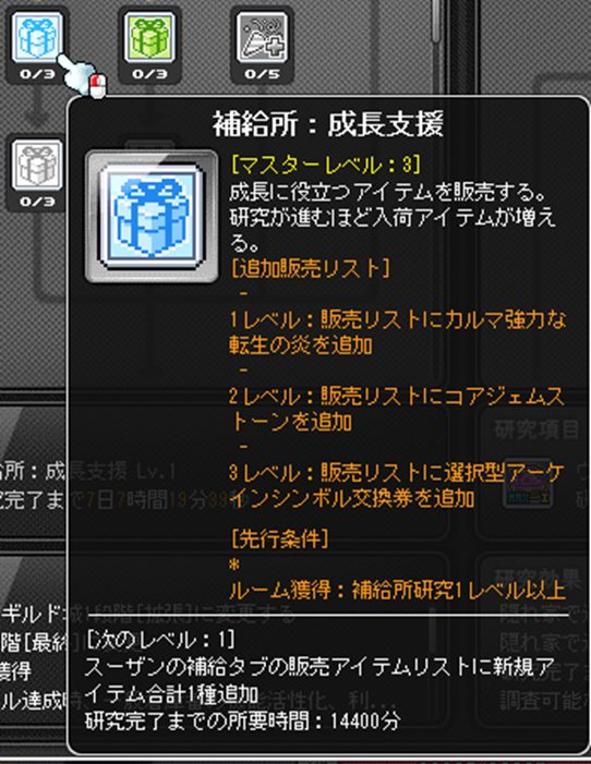 カルマ転生の炎も、コアジェムストーンも、補給所で買うよりオークションで買った方がきっと安いとは思いますが、次段階の研究「補給所:戦闘アイテム」に進めば、ここでしか買えない謎のアイテム・ギルド城ブローチが買えるようになるので、楽しみに待つこととしましょう。