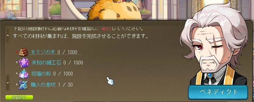 必要な素材はプールと変わらずモミジの木、未知の細工石、祝福の粉が各1000個、職人の息吹が30個です。
