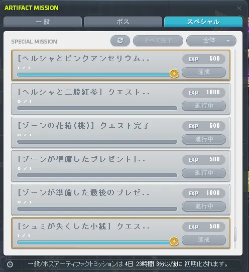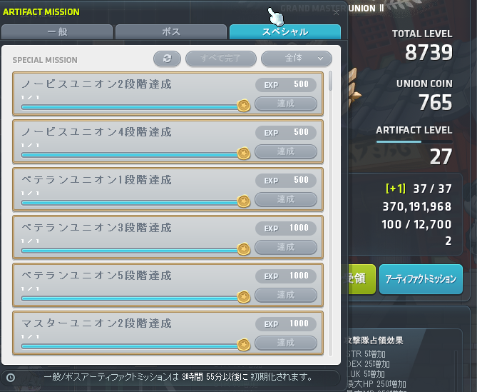 ユニオンアーティファクトのレベル上げには、ミッションをクリアする必要があります。 毎週狩りやボスを倒し、一般/ボスミッションをこなしていけば徐々にレベルは上がっていくのですが、ここで気になるのが業績に紐づいたスペシャルミッション。