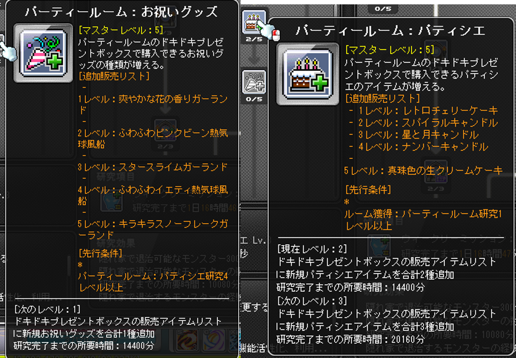 よくよく確認したら、「共同研究」タブにでパーティールームのショップラインナップを拡張できました。 イエピンの熱気球などは「共同研究」を進めることで購入できるようです。