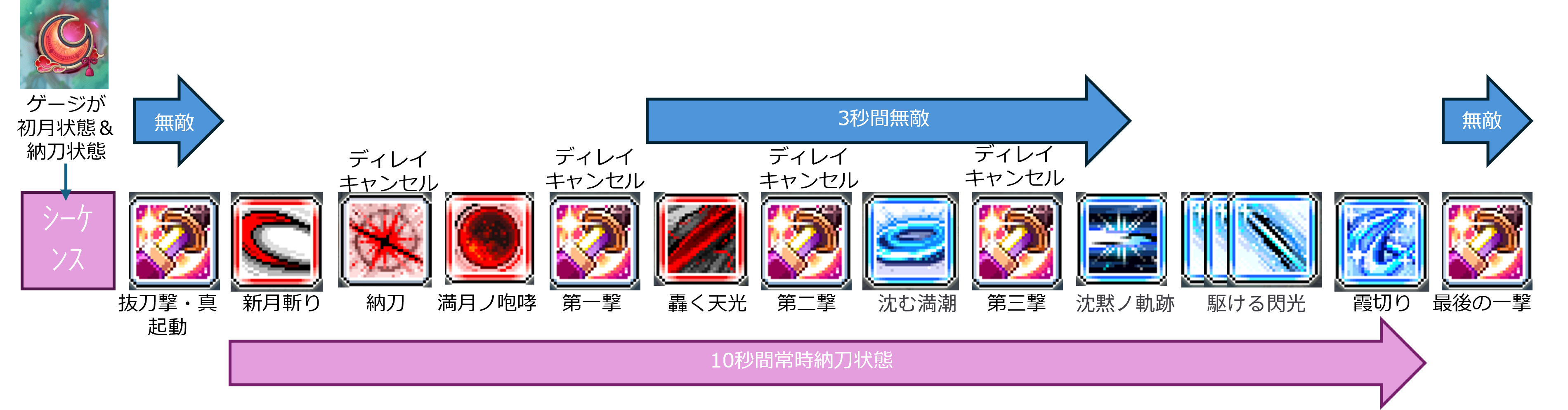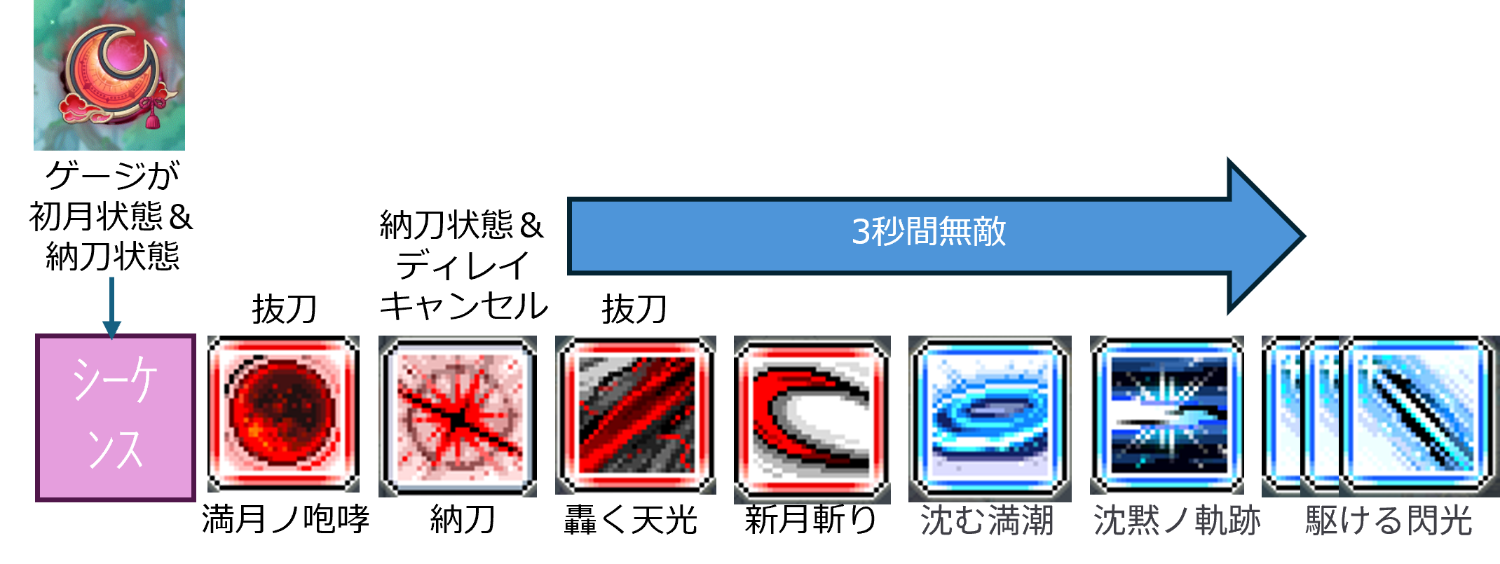 シーケンス>満月ノ咆哮>納刀>轟く天光>新月斬り>沈む満月>沈黙ノ軌跡>駆ける閃光×3