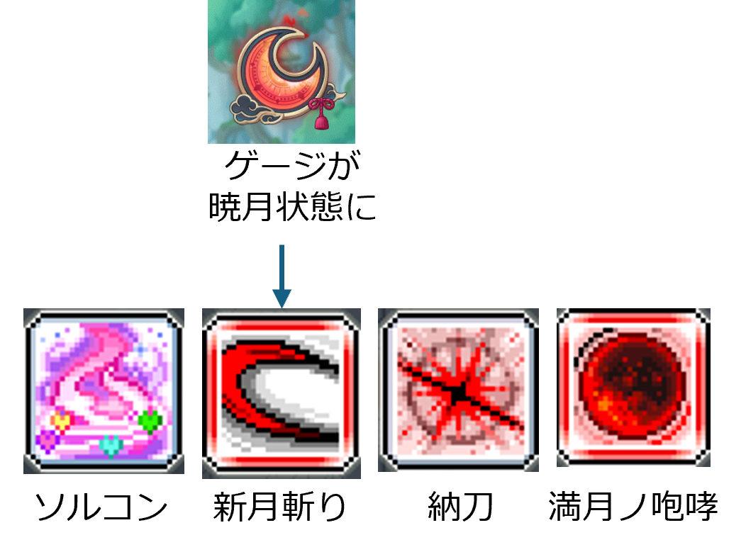 CT-7秒以上積むことが出来れば、暁月状態の40秒間に新月斬りを4回打てるので強い らしいです。 ここらへんは本腰を入れて検証するつもりは今のところ無いです。