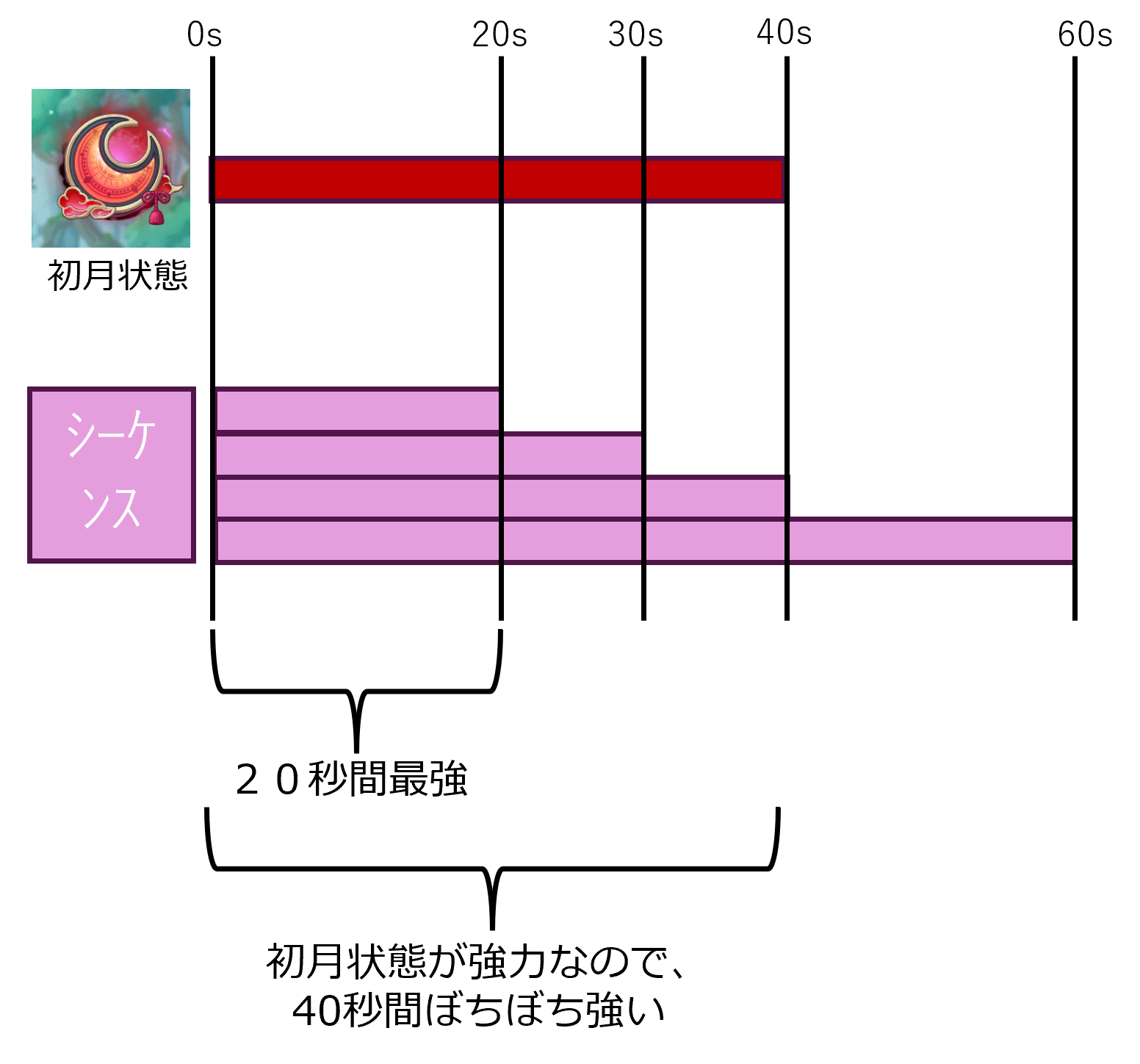 バフシーケンスを発動した後の20秒が最も強く、そのあとは徐々に減衰していきます。