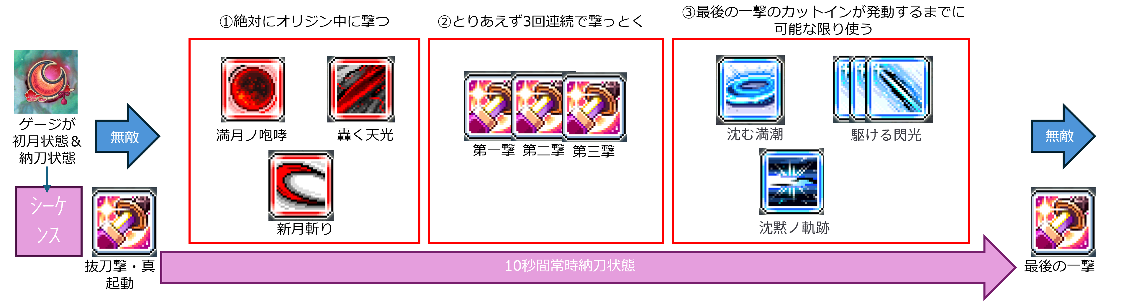 先述の通りオリジン発動中は常時納刀状態であるため、ぶっちゃけオリジン発動中に抜刀スキルを確実に打てているのであれば順番はバラバラで良いと思います