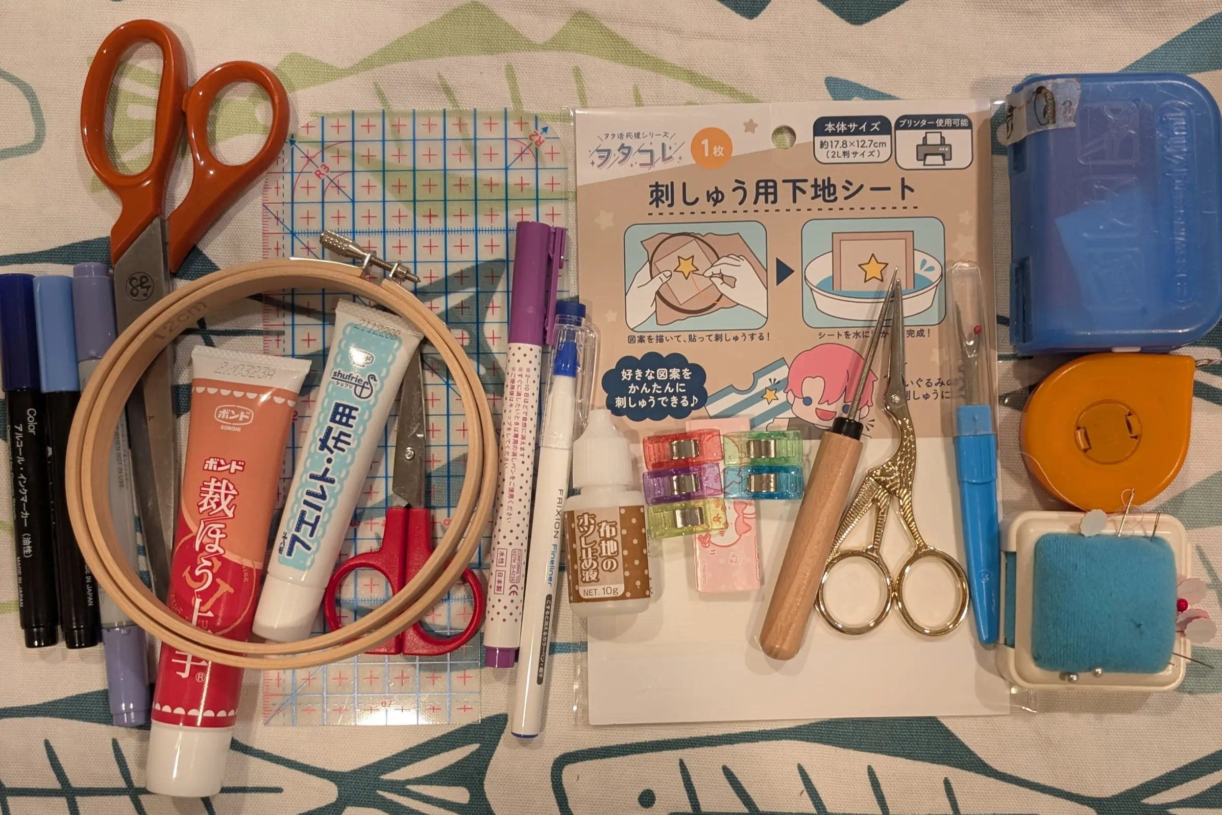コニシの「布・フェルト用ボンド」が、乾いてもボンドが硬くならないのでオススメ。逆に硬くしたい時はコニシの「ボンド 裁ほう上手」がオススメ。 - パッチワーク用の小さいハサミ