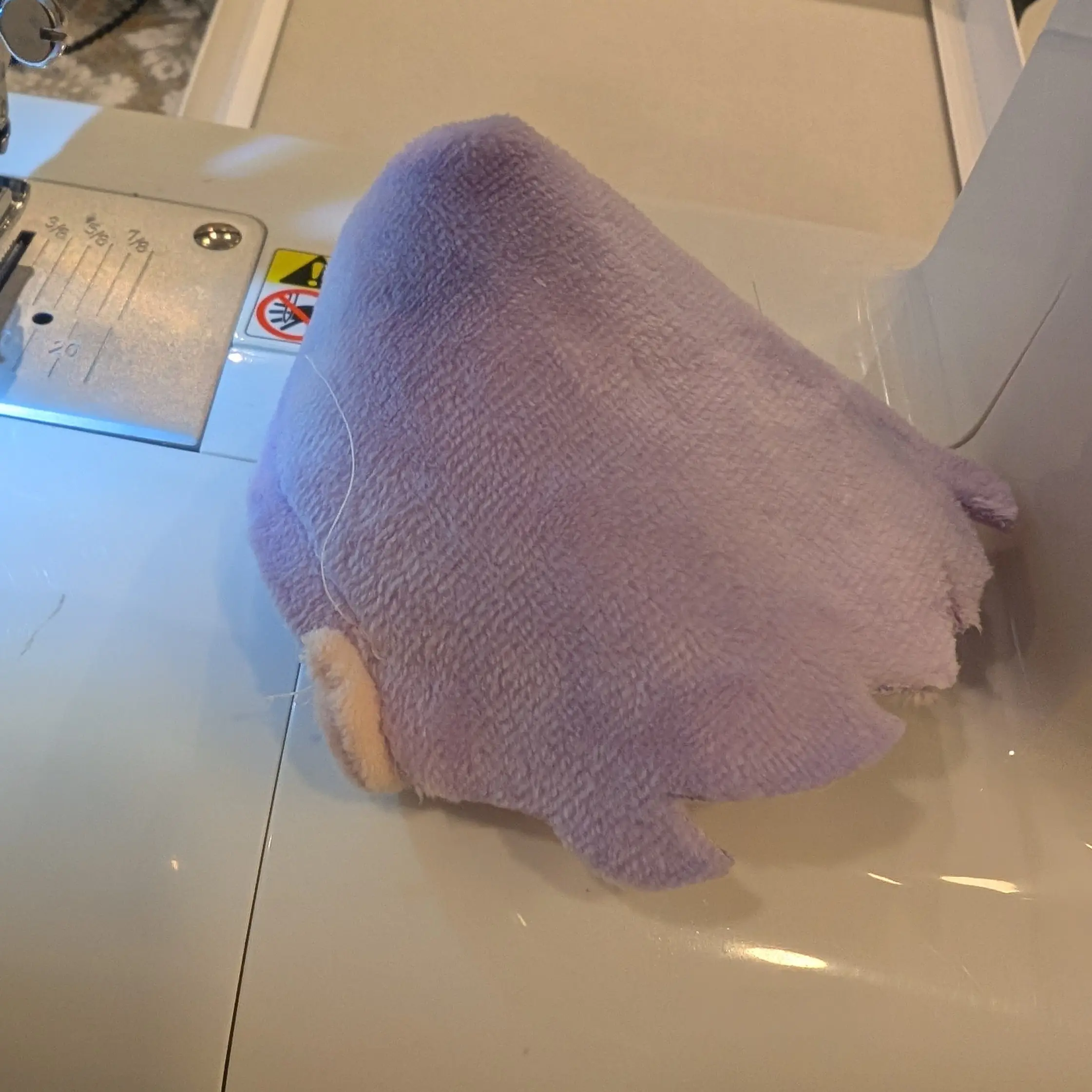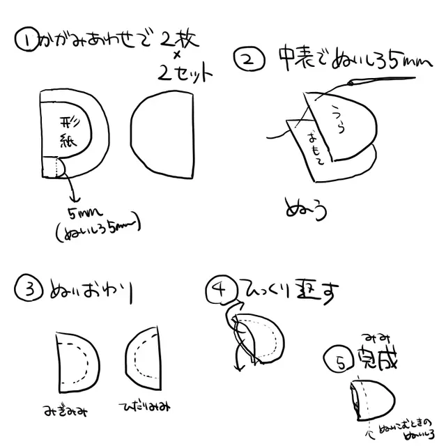 耳は厚みがあった方が好みなので、型紙から5mm大きめに切り取った半円状のパーツを2枚用意。表面同士を重ね、縫い代5mmで弧部分を縫い合わせ、最後に弦の部分からひっくり返す。これを2つ用意し耳にします。