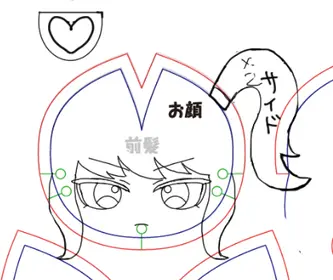 前髪・後ろ髪パーツは、別レイヤで作成したものを顔パーツに重ね合わせ、調節します。髪の毛束は細かい部分は再現が難しいので、大胆にデフォルメした方が失敗が無いです。