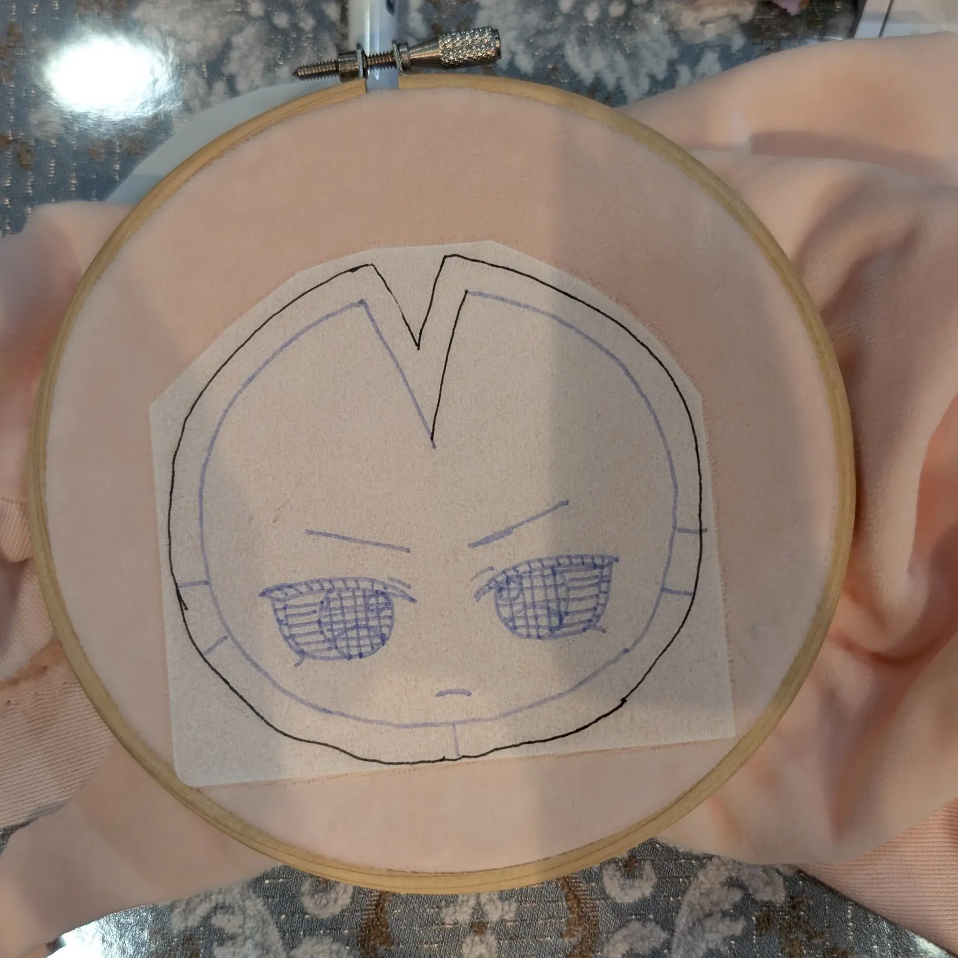 刺繍シートにフリクションペンを使って目を含む顔の型紙を写し取ります。