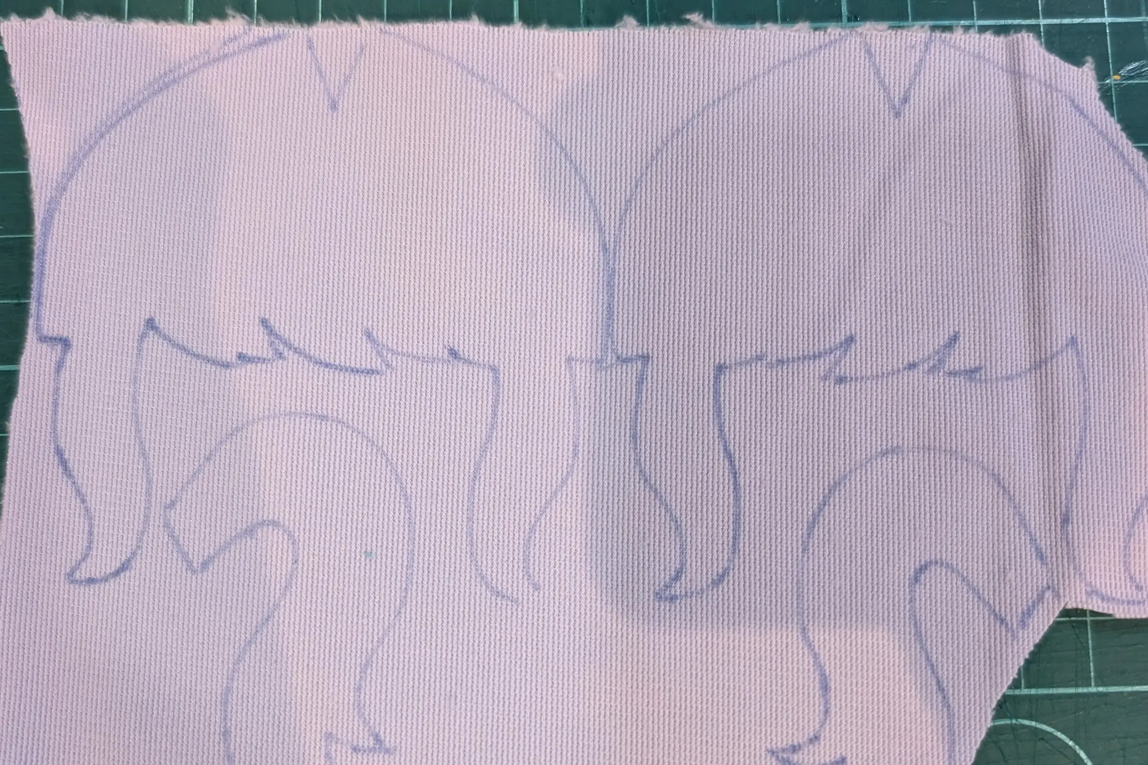 後髪は鏡合わせになるようにパーツを切りだし、布の裏面同士をボンドで貼り合わせ1つにします。これはスキンボアのほつれ防止と、ぬいぐるみの前後どちらからでも、スキンボアの表面が見えるようにするためです(が、布に厚みが出てしまい、結果的に非常に取り扱いづらかったです)。サイドテールも同様。