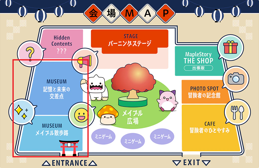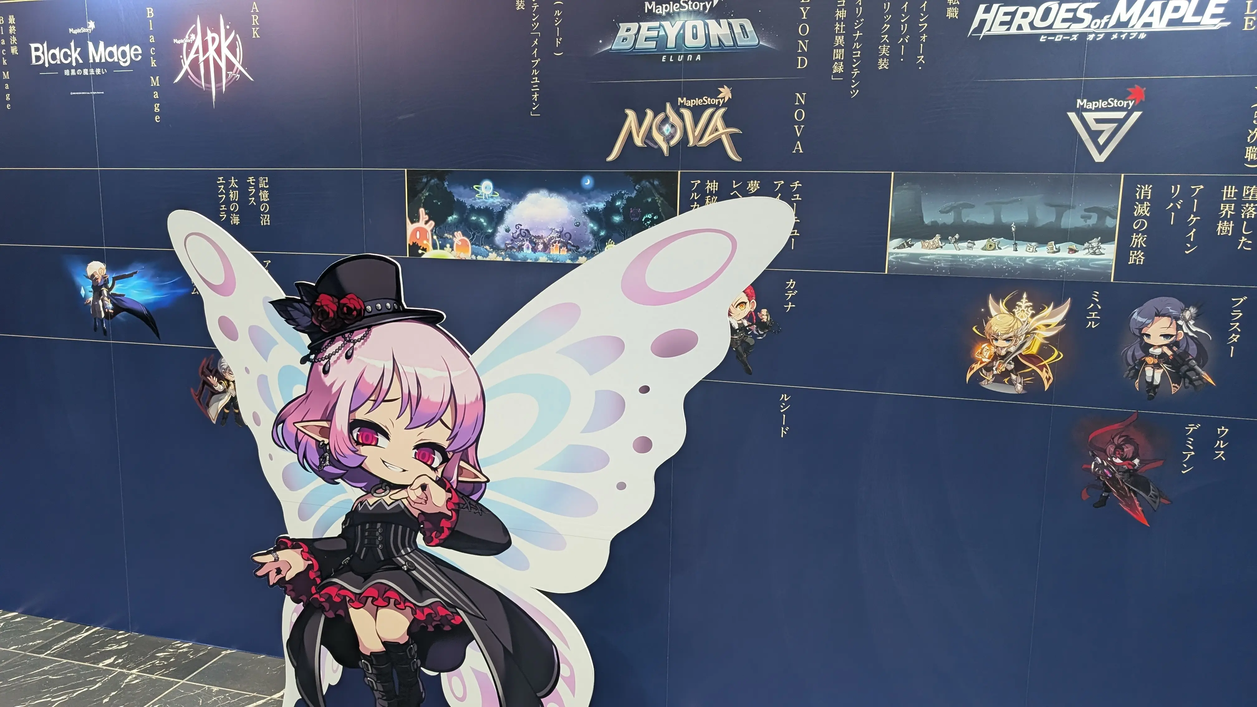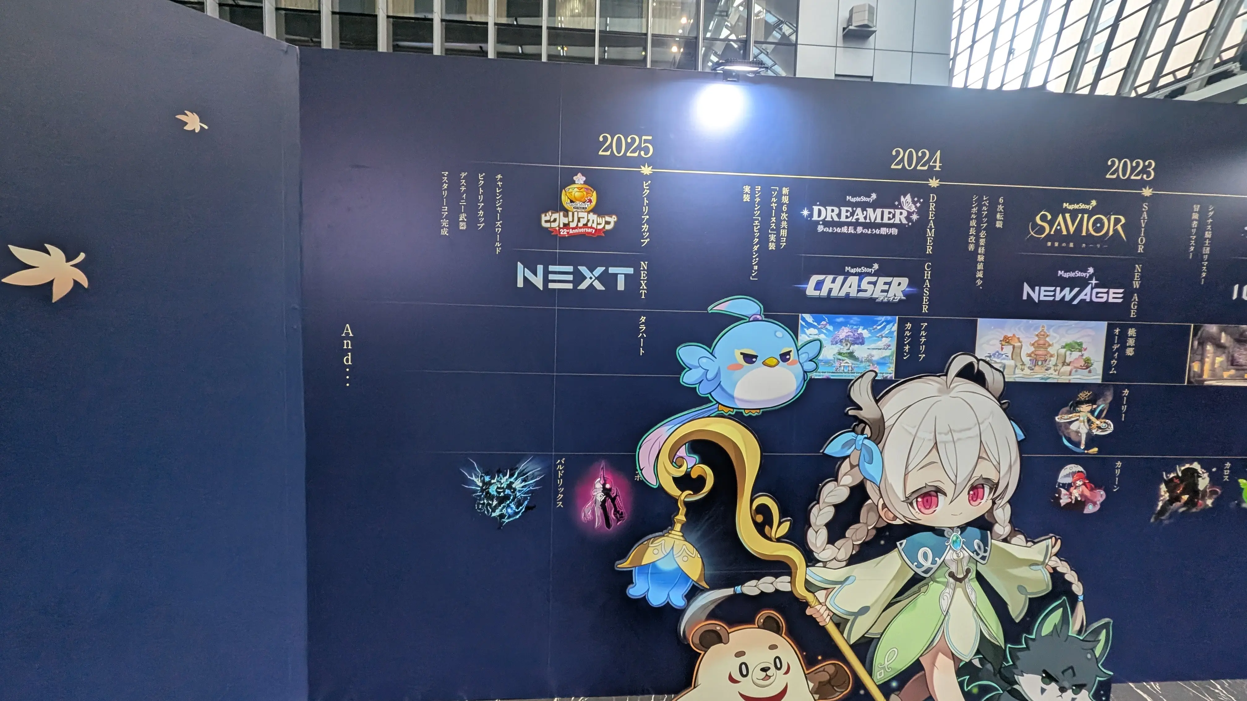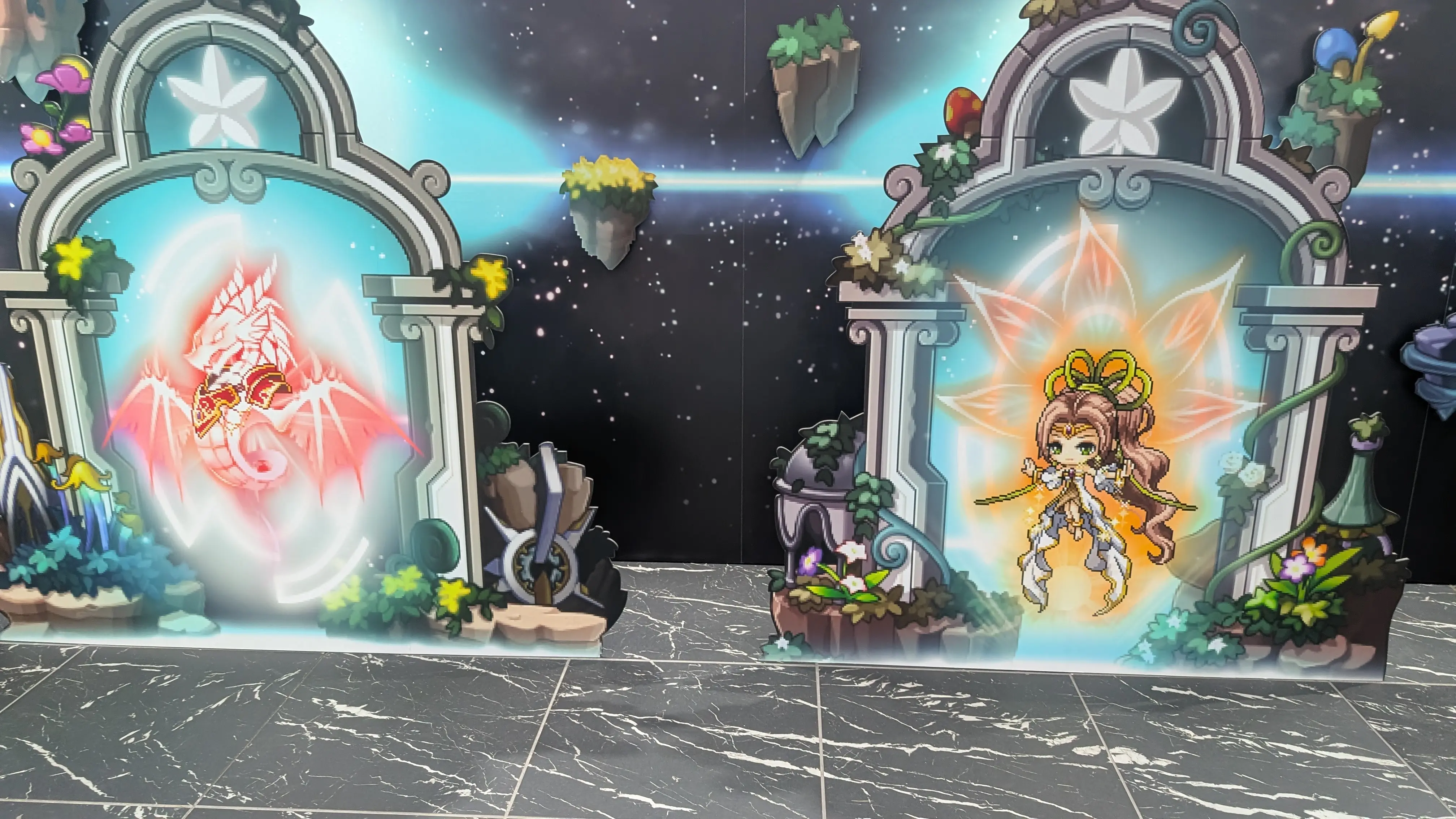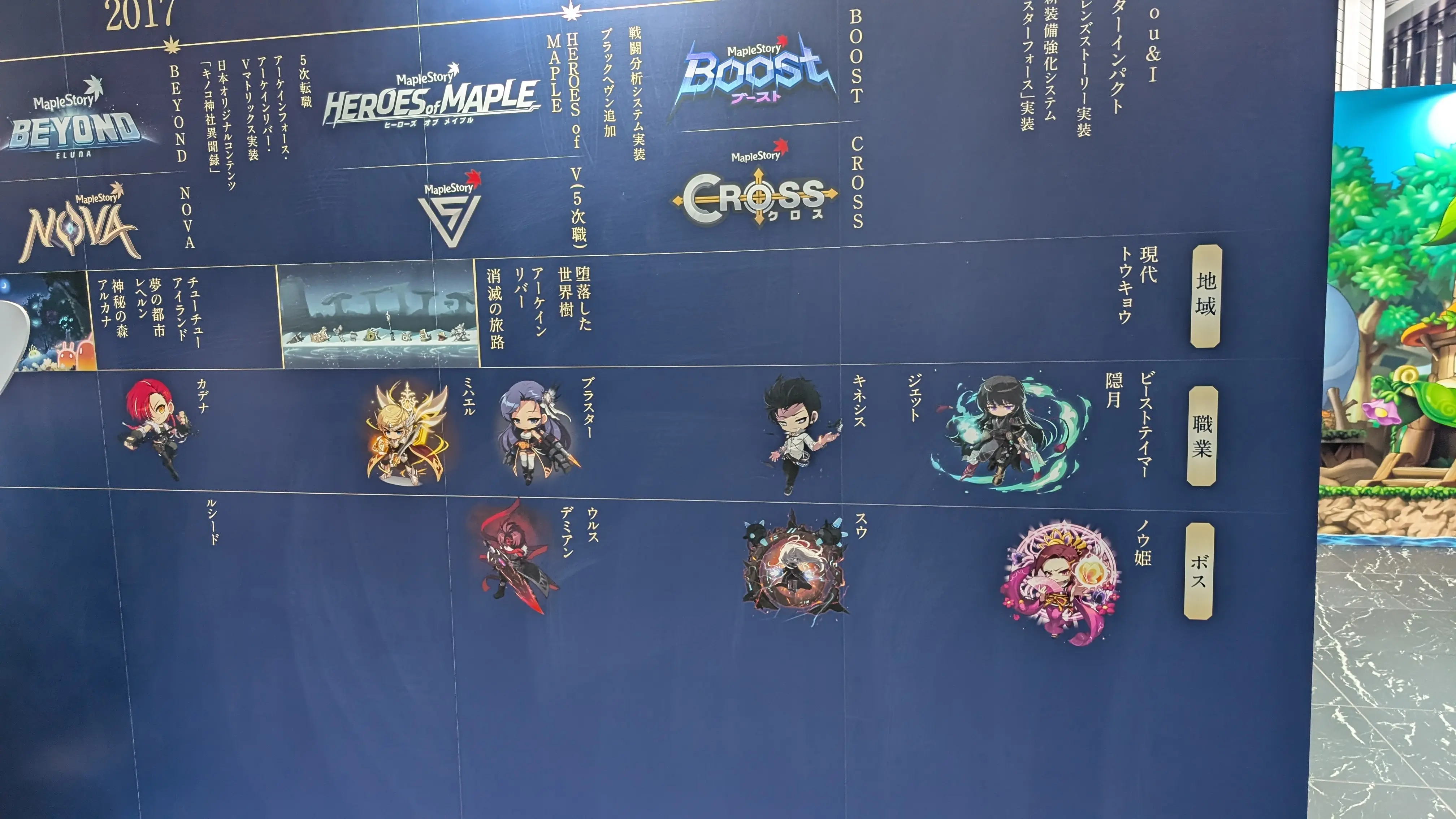 会場内はパネル展示が行われていました。入場してすぐ、メイプル散歩路には、メイプルワールド~アーケインリバー~テネブリスのパネルと、22年の歩みを綴った年表の展示がありました。