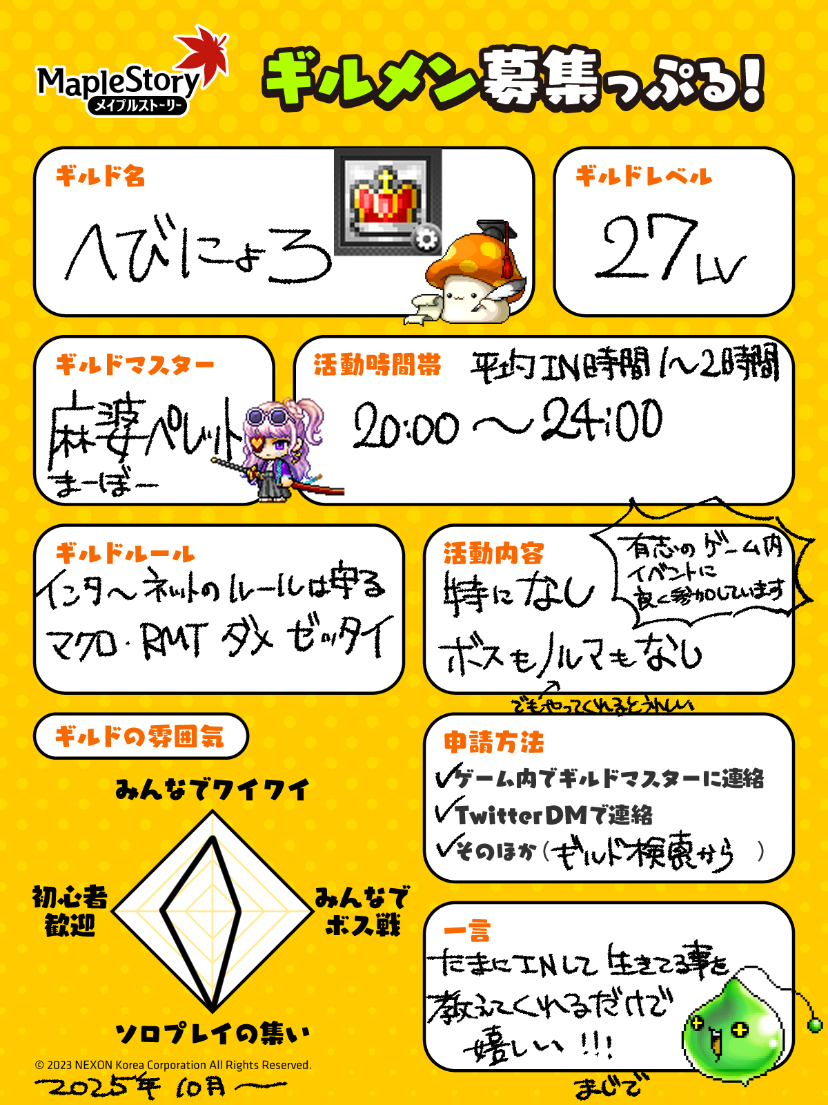 「へびにょろ」は株式会社NEXONが提供する基本無料MMORPG「メイプルストーリー」のかえでサーバーで活動するギルドです。